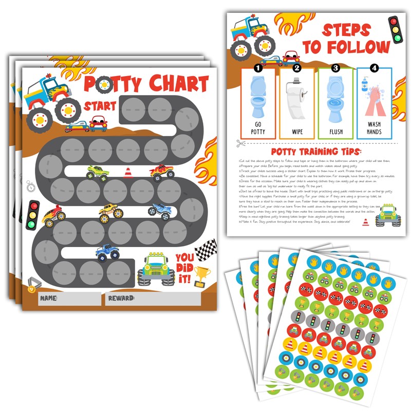 - Truck Themed Kit-The kit includes 10 - 8"x10" potty traininging kids reward chart (240 slots total) and 5 - 5.43"x8" potty training sticker chart sheets (54 stickers per sheet and 270 in total) and 1-8"×10" potty traininging tips