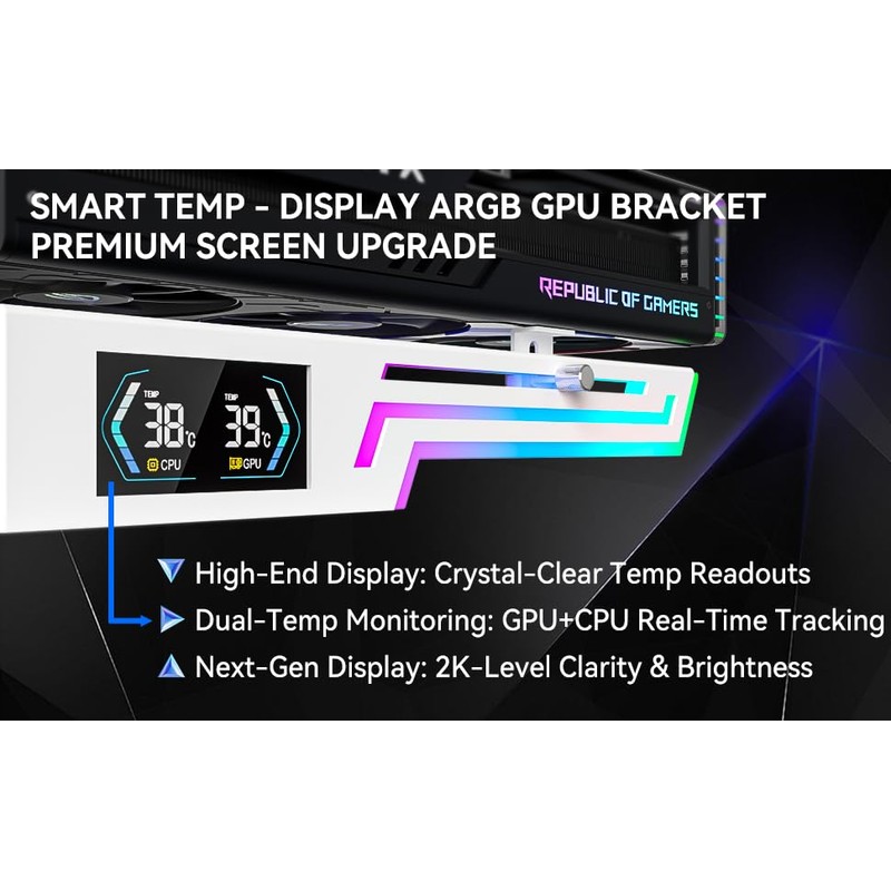 - 【Dual Mode Digital Screen & RGB Fusion】Elevate your build with a digital temp screen (real - time GPU/CPU monitoring) & 16.8 million RGB colors. As a stylish gpu support stand, it syncs with AURA/RGB Fusion via 5V 3 - pin/9 - pin USB—perfect for creating a personalized vibe while tracking temps. Ideal for show - off gpu vertical mount setups.