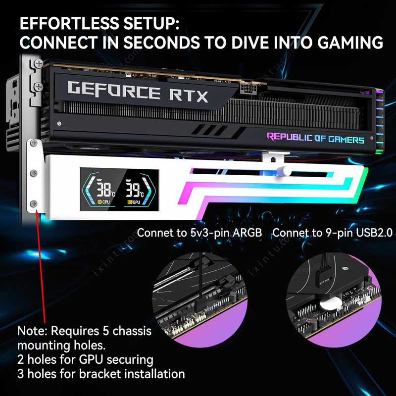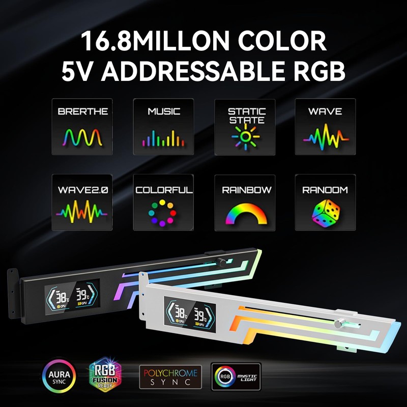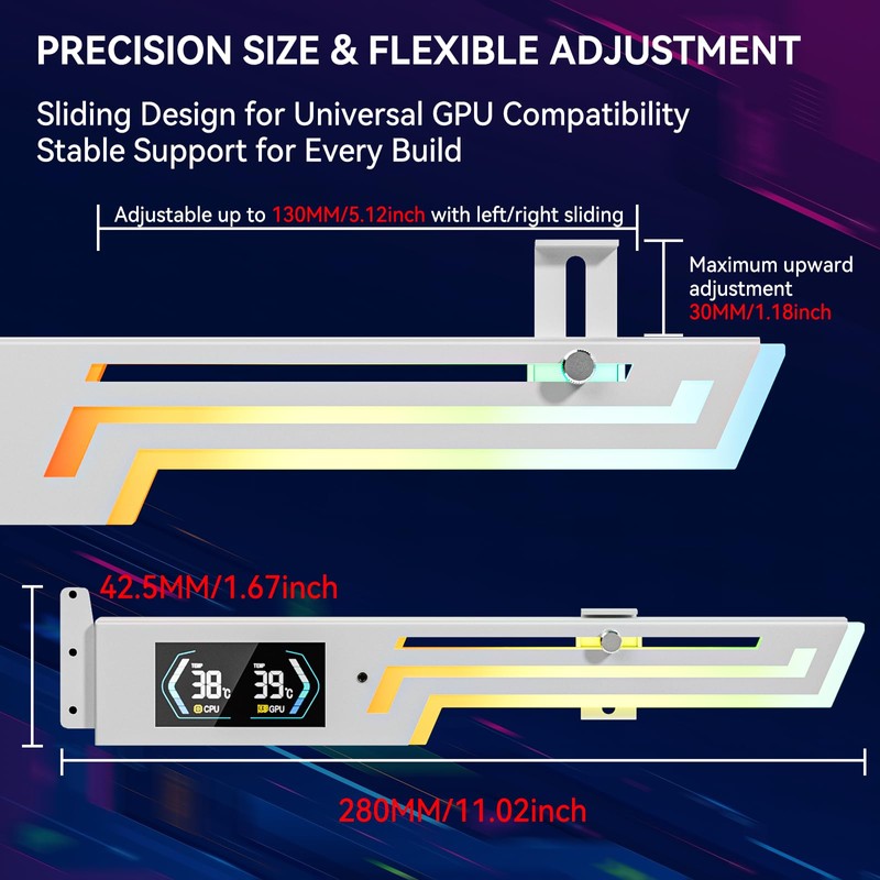 - 【8+ RGB Modes & Endless Customization】Choose from Breathe, Music Sync, Rainbow, & more! This graphics card bracket lets you match your setup’s theme with dynamic lighting. The digital screen adds a high - tech touch, making your gpu stand the centerpiece of your build—perfect for RGB enthusiasts.