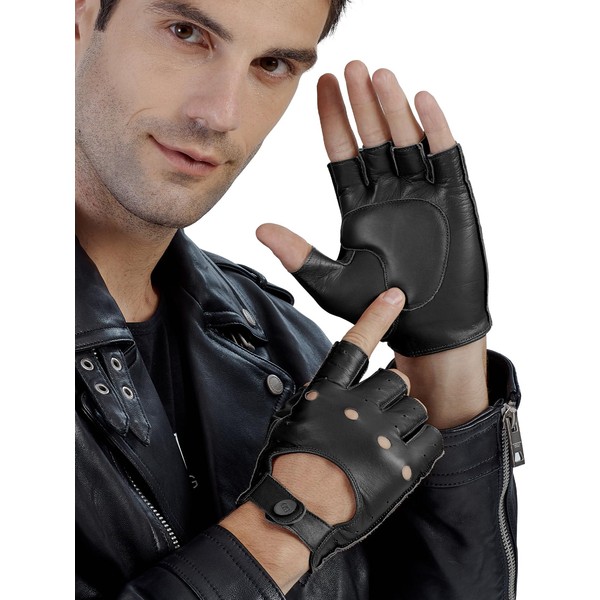 - Black Fingerless Gloves for Men - Classical Driving Gloves. NO Fingertips Allows for BETTER use of Touchscreen. Mens Motorcycle Gloves with a Supple Padding to Protect your Hands while still Keep your Fingers Free! All Season Men's Genuine Leather Biker Gloves.