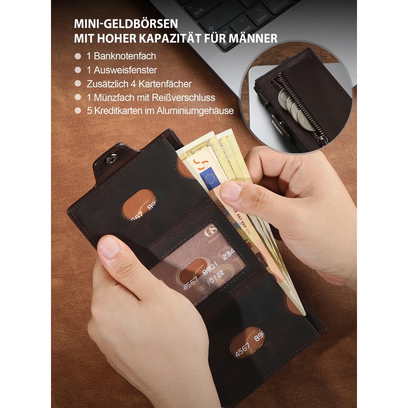 - SPACIOUS DESIGN This wallet can hold up to 5 credit cards in an aluminum case and features 4 card slots, 1 ID window, a zippered coin pocket, as well as a bill compartment. Its compact size allows for effortless storage in trouser or handbags.