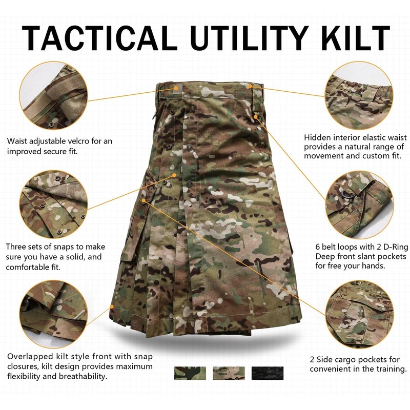 - UTILITY CARGO POCKETS. Pleats scottish utility kilt, solid camo highland looks. This mens kilt has 4 pockets including 2 slant hand pockets and 2 cargo pockets to provide ample storage and easy access to all your mission-critical gear. Your can carry a man bag or other man accessories to enhance your masculinity. Suitable for safely storing your cell-phone, wallet, various tools, tactical equipment and other personal items or gadgets.