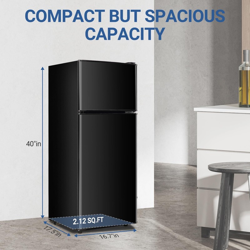- 【Space-Saving Design with Generous Capacity】Discover the perfect balance of compactness and ample storage. Measuring just 16.7 x 17.5 x 40 inches, this refrigerator fits seamlessly into any living space while offering a total capacity of 3.6 cu. ft. The larger 1.2 cu. ft. freezer section and 2.4 cu. ft. refrigerator section provide plenty of room for all your essentials.