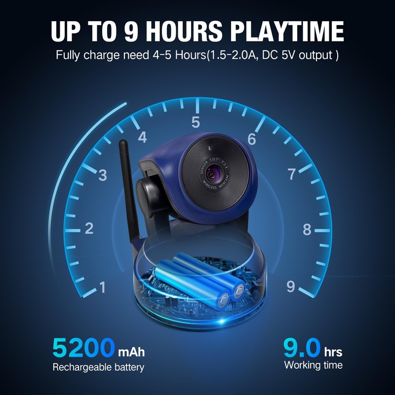 • ✔【9-HOURS Working Time】The webcam with Tripod Stand built-in 5200mAh rechargeable battery, extra long working time up to 9 hours on a single charge, never interrupt your video even power failure.(Note: Fully charge the item need about 4-5 Hours(1.5-2.0A, DC 5V output ), and webcam should last up to 9 hours playtime.)