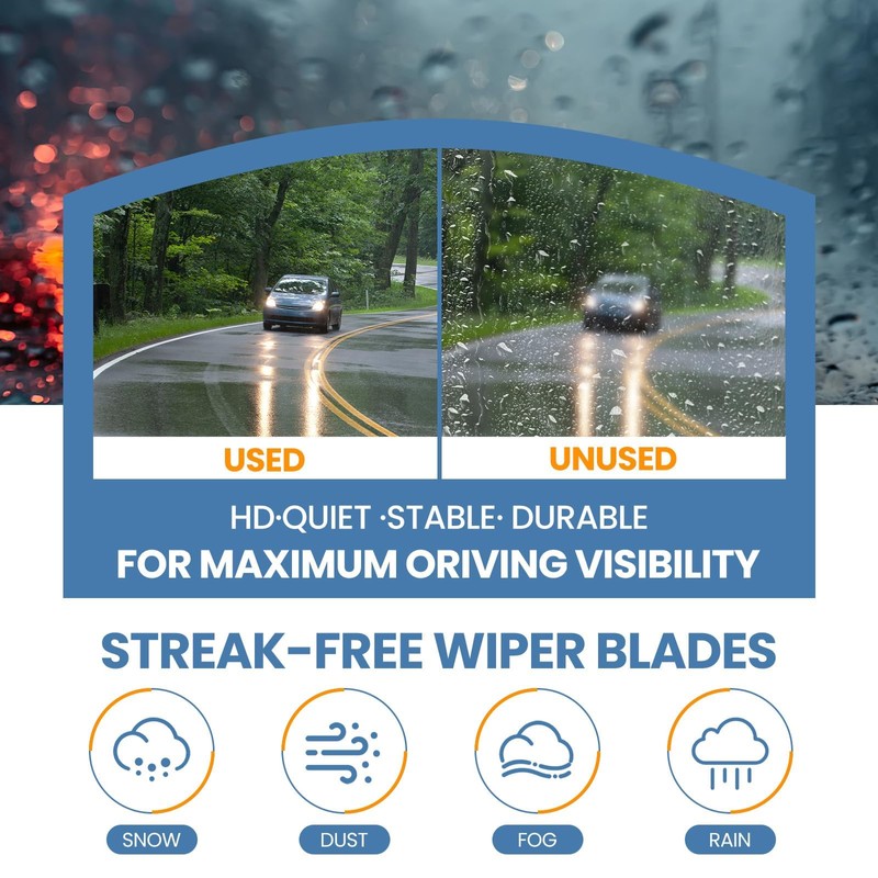 - 【All-season use】These wiper blades are suitable for all seasons. They can easily handle dirt and dust in high temperatures in summer, and quickly clear snow and ice in winter, ensuring clear visibility.