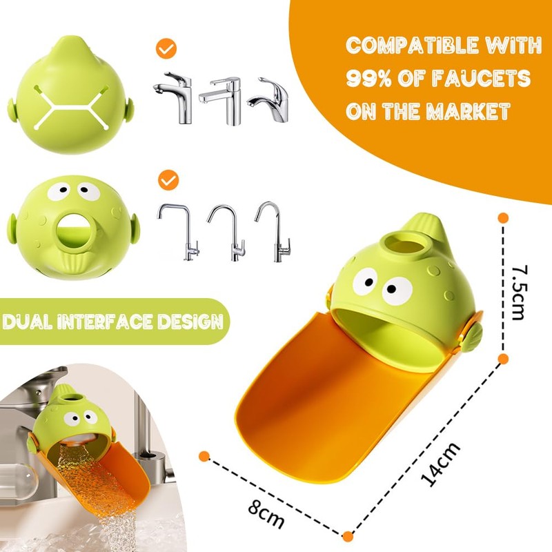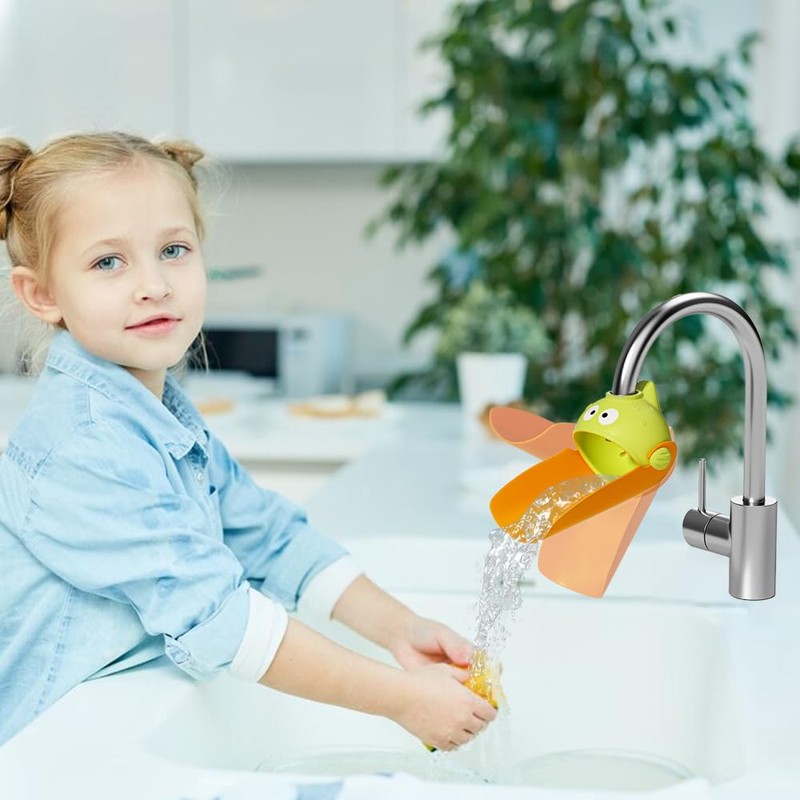 - ENJOY WASHING The faucet extension is specially designed for children. Cute and interesting cartoon shapes make children fall in love with washing hands. In addition, it catches water flow and prevents splashes, reducing water accumulation in the sink.