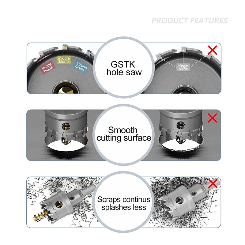 - 【 Latest improvements】:Our hole saw is made of high quality TCT Carbide( Tungsten Carbide Tipped Cutters), ensures its high hardness, rust proof and heavy duty. And the center drill adopts with high accuracy, it’s hard to break.Tipped tooth blade,faster cutting experience. Double round circles to remove metal filings easily and efficient cooling.