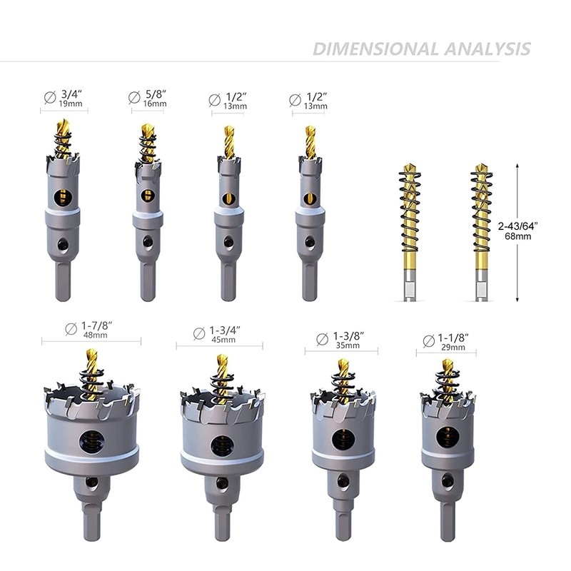 - 【8 of sizes to meet your different needs】: 2*13mm(1/2”), 16mm(5/8”), 19mm(3/4”), 29mm(1-1/8”), 35mm(1-3/8”), 45mm(1-3/4”), 48mm(1-7/8”), &2*Extra Titanium Plated Pilot Center Drill and 2*L-Wrench