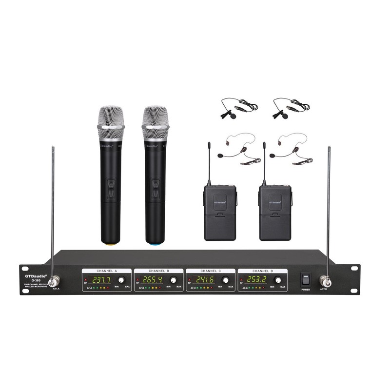 - 4 Channel Receiver with 2 handheld, 2 Belt pack transmitters & lavalier, headset Mics