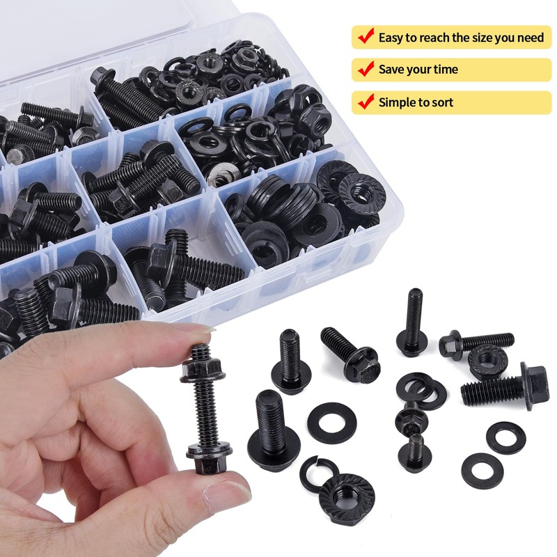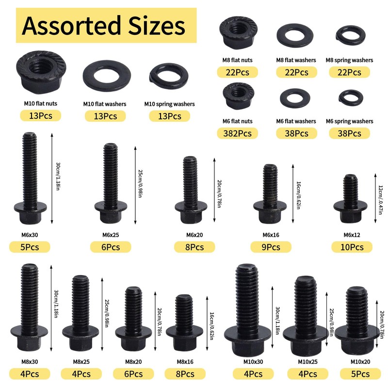 - 【Package Include】73 sets flanged bolts with matching nuts flat and spring washers kit, including 22 sets M8 flange bolts, 38 sets of M6 flange bolts 13 sets of M10 flange bolts, total 292PCS hex bolts nuts washers assortment kit