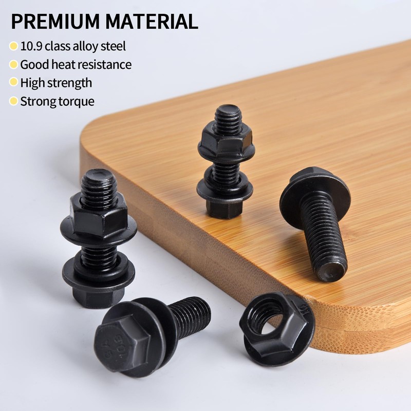 - 【Bolts Style】metric flange hex head(Non-Serrated); Pitch: M6-1.0mm M8-1.25mm M10-1.5mm; Fully UNC Thread; Finish: black zinc plated