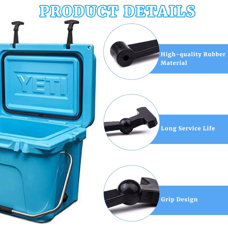 - HEAVY DUTY COOLER LATCHES: Replacement black cooler latches are made of high-quality and durable hard rubber material with good support effect. You can receive a total of 4 Pcs of fit for yeti cooler latches replacement. Cooler replacement latch has a smooth, textured surface and a good grip.