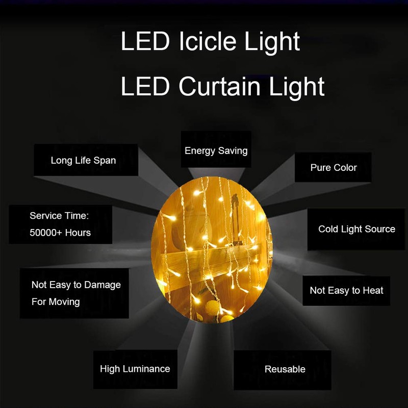 **GYDING LED Window Curtain String Lights Christmas Lcicle Lights for Wedding Party Bedroom Garden Patio Outdoor Indoor.** **8 Lighting Modes Easily Manipulated** Combination, waves, sequential, Slo-Glo, Chasing / Flash, slow fade, twinkle / flash, steady light, pressing the power button on the mini controller. **Safe & Energy Saving** UL Approved, cold light source has excellent heat dissipation. The LED light is very low heat generating, and also Ideal for indoor and outdoor use, it work properly even though in cold winter. **Copper Wire Technology** The wire covered in the clear plastic is copper wire, which is really flexible, conductive and durable. **High Brightness** 96 LED lights brighten up the happiness atmosphere inside or outside; 16 string lights in total, widespread lighting source. **Advanced Lighting Source** The source of light is a row of LEDs, which disperses light very well and provides powerful yet even light without harsh glare or shadows. **Extensive Applications** Ideal for decoration Indoor, Outdoor, Party, New Year's Day, Christmas, Valentine's Day, National Day, Easter, Halloween, etc. It can also be used for window displays, home and garden decorations, etc. **Specification:** Material - Plastic/Wire/Glass Bulbs 2 Color for choose: Warm White, Multi-Color Using method: Plug in Bulb size: Mini How Many Drops: 16 Number of bulbs on string: 96 Length of the lights: 4M/13Ft (Including the plug) Contains End-to-end connectors which allows you to connect multiple sets together (Connect 10 Sets Maximum)