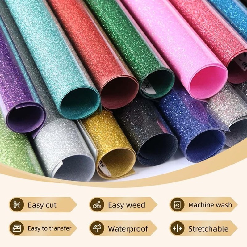 • 【Widely Used】: Our glitter heat transfer vinyl is your go-to choice for long-lasting projects, design your leather, T-shirts, bag, sweatshirts, aprons, hoodies, hats and many other garments, it is suitable for sports mesh fabrics, cotton, polyester and cotton blends, lycra/ spandex, textiles and more