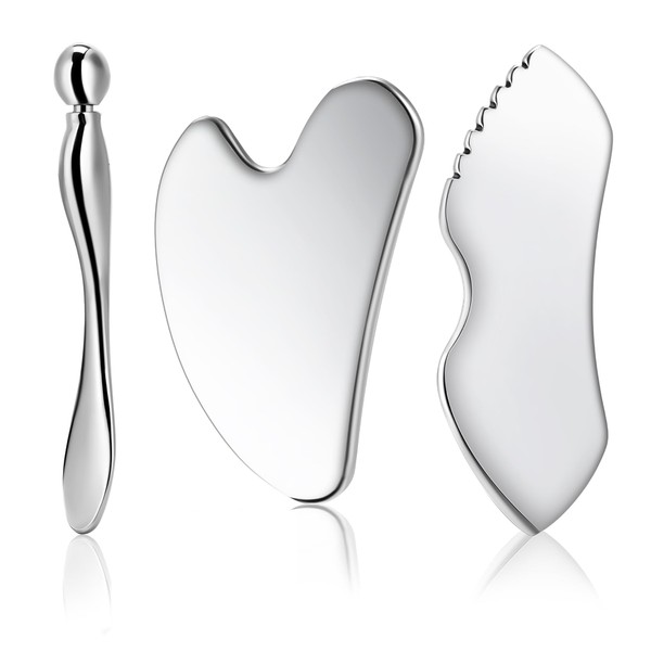 Gua Sha Facial Tools, 3 in 1 Stainless Steel Metal Guasha & Eye Cream Applicator Facial Sculpting Tool Set Eye Massager Lymphatic Drainage for Face Neck (Large1(Transparent box packaging), Unscented1)