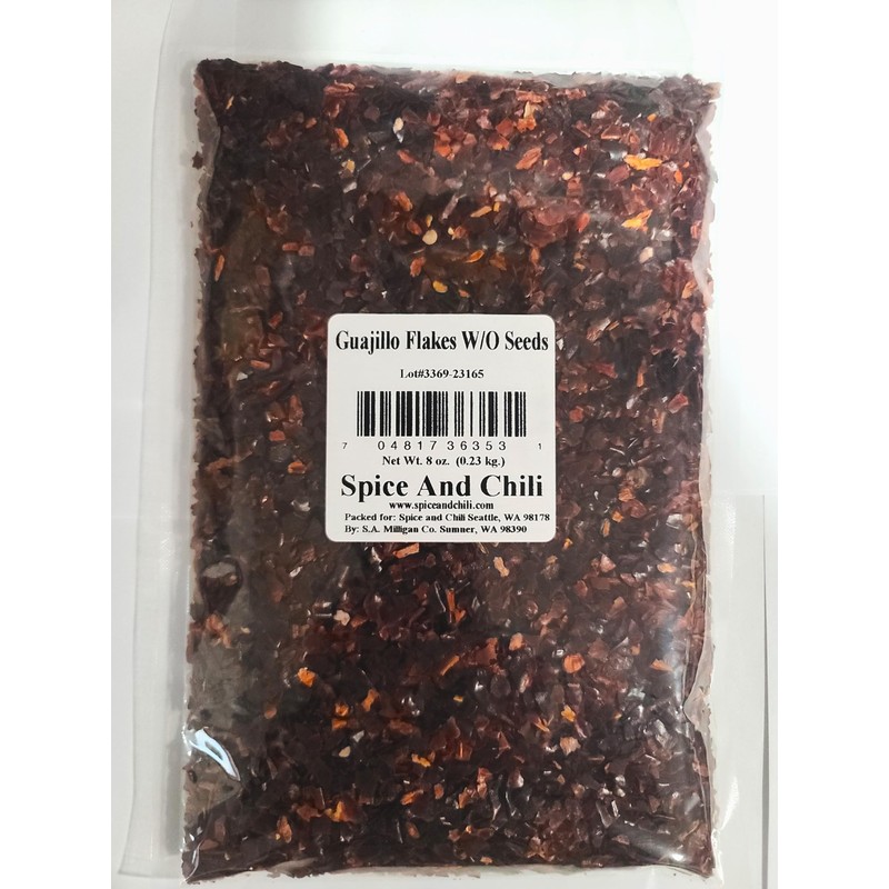 Guajillo chiles have a smoky flavor, sweet, fruity, tangy. Profile with notes of berries and tea.They have a mild heat and in flake form without the seeds in it.