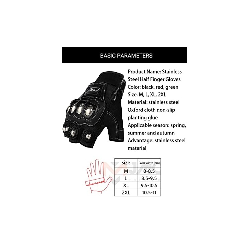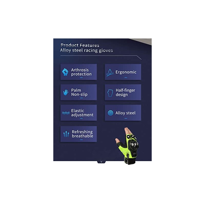 - Guantes de motocicleta para hombres y mujeres, guantes de moto con visualización táctil de medio dedo para BMX, ATV, MTB, carreras de carretera, ciclismo, escalada, motocross Información del producto Materiales: Espalda: 50% poliéster + 20% nailon + 20% PVC + 10% inoxidable Palma: 70% poliéster + 10% nailon + 20% PVC Materiales de forro: 70 % poliéster + 30 % espuma Color: negro, rojo, verde, azul. Tamaño: M, L, XL, XXL. Adecuado para: entusiastas del ciclismo, equipos de motocicletas, escaladores, entusiastas del aire última intervensión, ciclistas eléctricas, etc. (Dedo completo/transpirable/visualización táctil/antideslizante, anticaída/a prueba de golpes, resistente al desgaste, cómodo/anticaída). Características: 1. Protección completa a la mano: con protección, carcasa anticolisión de fibra de carbono 100% protección completa, cómoda y moderna. Con la máxima protección para las articulaciones, las articulaciones de los dedos están hechas con protección anticolisión. 2. Protector adicional para palma: la palma añadida con almohadillas para orejas SBR de 5 mm más gruesas reduce las abrasiones y las fracturas, absorbe el impacto y los golpes en caso de que ocurra un choque. Puede evitar eficazmente que el dolor de la palma se mueva durante mucho tiempo y la abrasión de la palma al caer. 3. Transpirables y cómodos: nuestros guantes deportivos de medio dedo están hechos de poliéster transpirable con el agujero transpirable en la palma, duraderos y cómodos, ofrecen una sensación suave y cómoda, adecuados para todas las estaciones. Contenido del paquete: 1 par de guantes de motocicleta