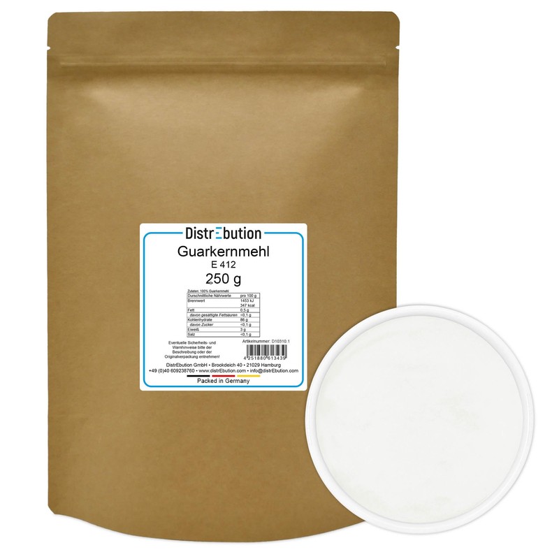 Guar gum is a vegetable food additive (E 412), mainly used as a thickening and gelling agent. Even small amounts of guar gum are enough to give liquids a viscous consistency. The viscosity of this guar gum is 3500 cps. Under the influence of shear forces (e.g. B. shaking, stirring) guar gum becomes thinner. However, as soon as the shear forces decrease, the viscosity of the product increases again. The guar gum is easily soluble in both hot and cold water.