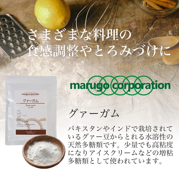 - Ice, Noodles, Sauces, and More: Adds stickiness and thickness to liquids, prevents moisture from separating, and keeps moisture in foods, so it can also be used for jams, salad dressings, and more.Guar gum synergistically increases viscosity when used with xanthan gum.It can be used to prevent roughness in ice cream, improve the texture of noodles, and improve the coverage of sauces.