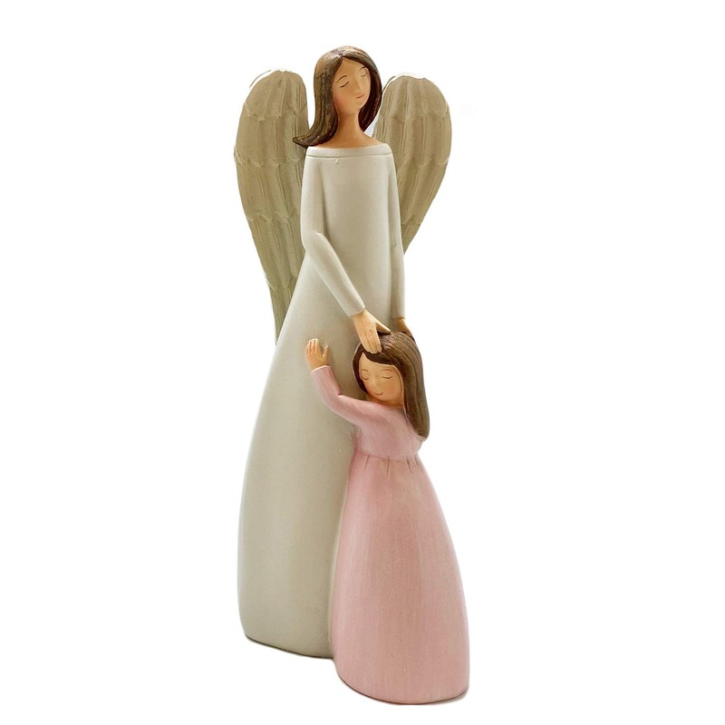 This beautiful statue would be a perfect gift for a daughter, sister, aunt, niece or goddaughter. It depicts a brown-haired angel in a white dress holding the hand of a young girl.