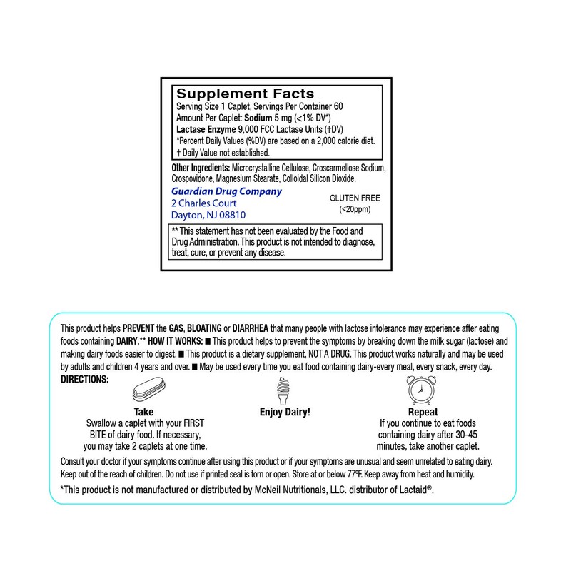 Guardian Dairy Relief Fast Acting Caplets, 9000 FCC, Lactose Intolerance Pills, Lactase Enzyme (360CT (Bottles))