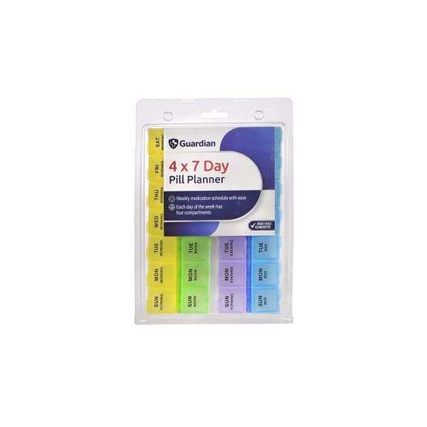 Organise your weekly medication schedule with ease with the Guardian 4x7 Day Pill Planner. Each day of the week has four compartments, each compartment relates to the time at which medications are to be taken.