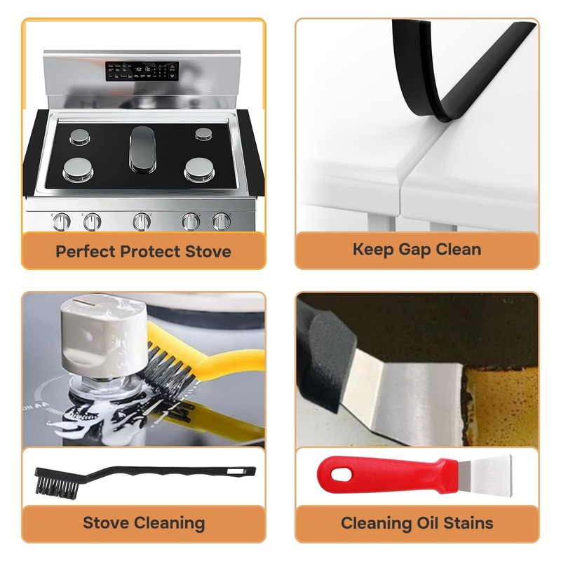 - Comprehensive Set: This Guards for Gas Stove Top Protector set includes three stove mat Top cover protectors, two stove gap fillers, cleaning brushes, and a scraper, ensuring you have all the tools needed to keep your kitchen clean and organized. It's a one-stop solution for stove maintenance