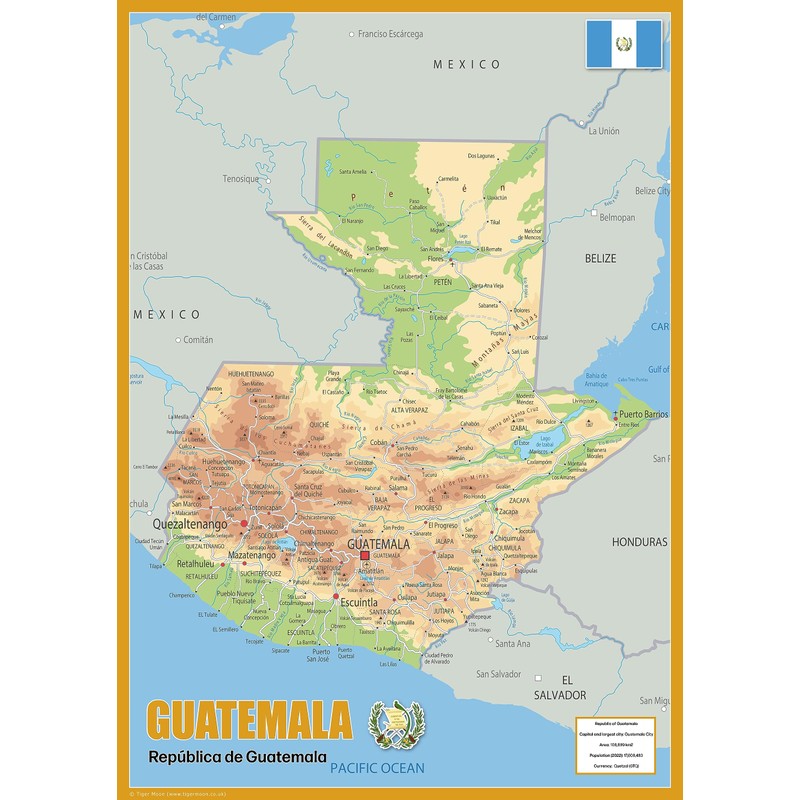 - Our physical poster map of Guatemale boasts key attributes such as the capital city, population, area size, and main cities. In addition, this physical map shows state lines, highways, and airports, as well as oceans, lakes, and renowned attractions such as national and state parks, forests, and cultural sites. It is a perfect asset for classrooms and an exceptional resource for learning all that the country provides.