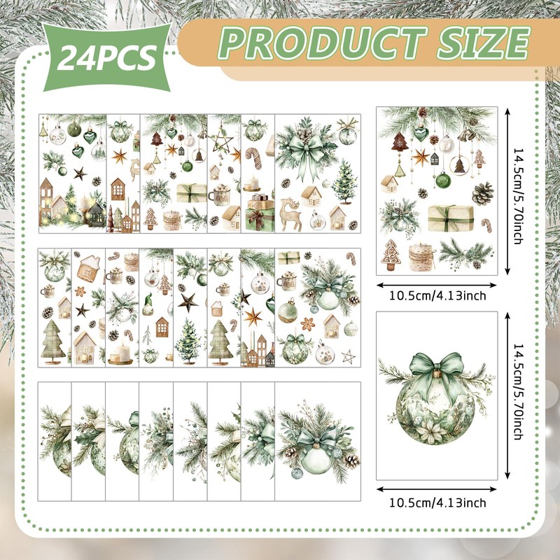 - Captivating Christmas Designs: infuse your holiday decor with charm using our 24 piece Sage Green Christmas Rub Ons; Embrace the festive spirit with a rich variety of designs including snowflakes, Christmas balls, green bows, gnomes, snow villages, and pine branches