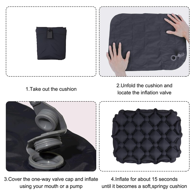 - Easy to Use: Just blow gently or use a portable pump to inflate in seconds. The inflation process of inflatable cushion is very simple and fast, without complicated operations. Similarly, the air cushion deflates very quickly, making it easy to store and pack. This quick inflation and deflation design not only saves your precious time, but also makes travel seat cushion very convenient to use and store.