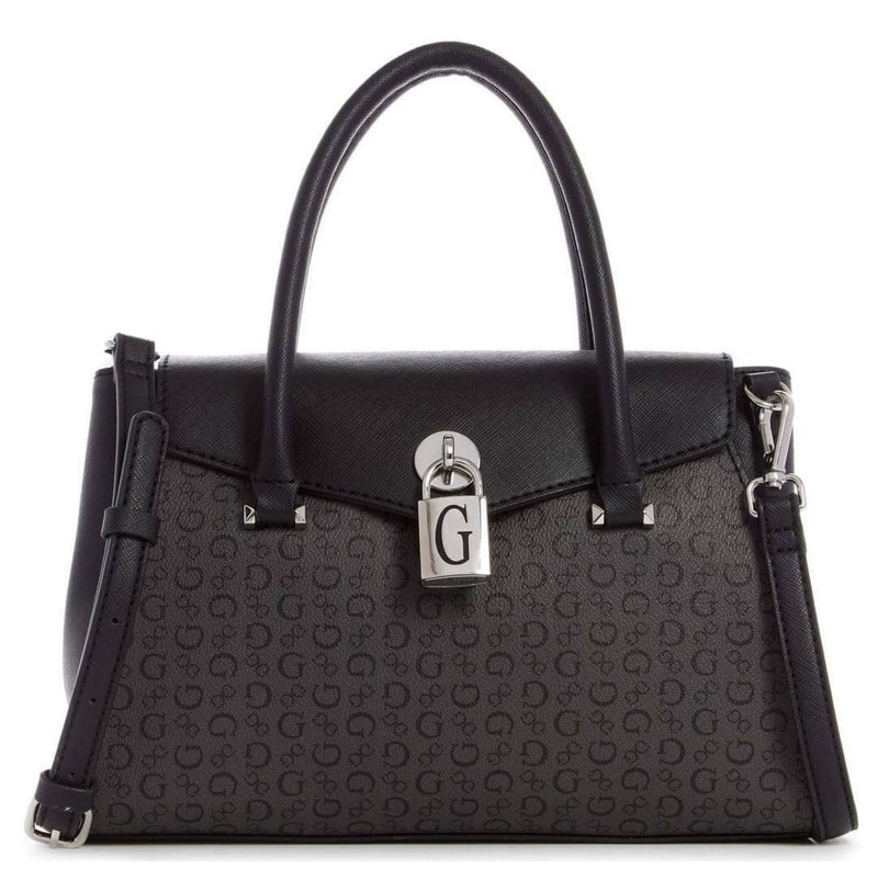 GUESS Women's Godfrey Black Logo Print Lock Charm Medium Satchel Shoulder Crossbody Bag Handbag