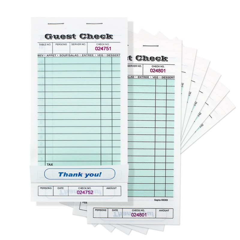- Package includes:You will receive 15 books notepads,each book comes with 50 guest checks,750 sheets total.Guest check size is 3.43" x 6.77",perfect for service book and apron pockets,can be quickly separated from notepad