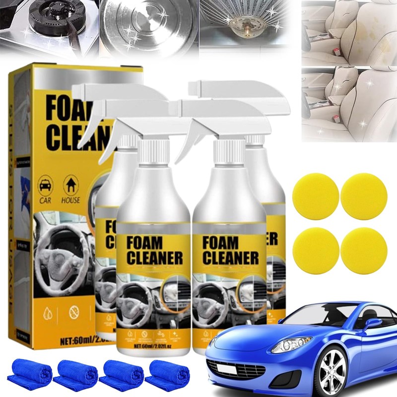 Easyglow Magic Foam Cleaner, Shoplari Foam Cleaner, All-Purpose Rinse-Free Cleaning Spray, Multi-Purpose Foam Cleaner, Multifunctional Foam Cleaner for Kitchen and CarWhy choose the Magic Foam Cleaner?1. Effortlessly Removes Stubborn Grease2. Leaves Surfaces Spotless and Shiny3. Saves Time, Energy, and Money4. Mild formula, No Damage for the Surface5. Works on a Wide Range of SurfacesHOW TO USE:1. Spray Foam Cleaner directly on the desired area.2. Wipe with a towel or sponge until the stain is removed.3. No need to rinse. After cleaning, wipe off the foam with a towel.SPECIFICATIONS:Product: Easyglow Magic Foam CleanerProduct capacity: 60MLShelf: 3 yearsApplication: Car, Kitchen, BathroomPACKAGE INCLUDED:1/2/3/4 pcs * Easyglow Foam Cleaner1/2/3/4 pcs* Sponge1/2/3/4 pcs* Cleaning clothNOTE:1. Due to differences in lighting and screen settings, the colour of the item may differ slightly from the pictures.2. Please allow slight differences due to manual measurement.