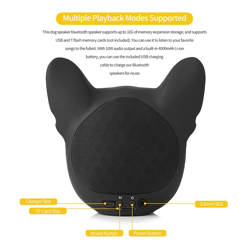 - 10W OUTPUT POWER: Our portable dog bluetooth speaker supports 5W audio output and has a built-in 4000mAh lithium battery. Unlike some bluetooth speakers on the market that have to be connected to a power source, you can recharge ours with the included USB charging cable to use again.
