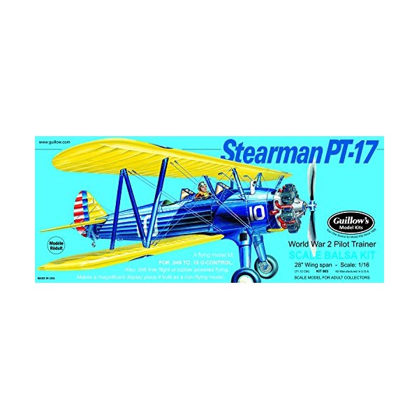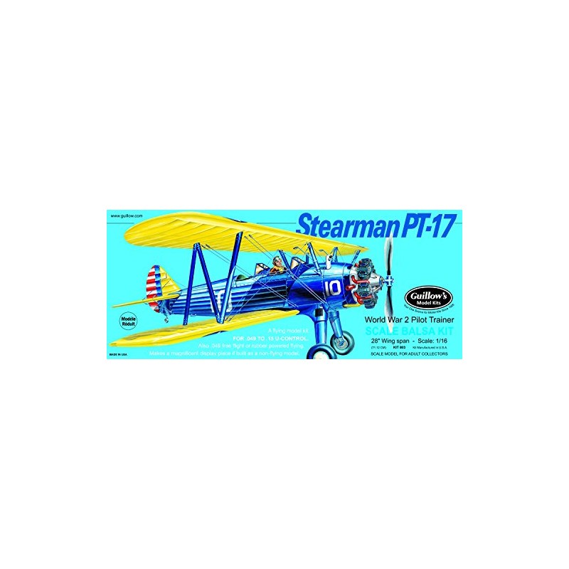 Stearman PT-17 has a 28" wingspan. The majority of U.S. pilots of World War 2 received their primary flight training in the famous Stearman Trainer. This excellent 2-place biplane was known as the PT-17 when delivered to Army flight training centers. The Navy designations were N2S-1 and N2S-4. Nearly 3,000 were built in the 1940-43 period and, in the post war era and up to modern times, the Stearman Trainer has been successfully used as a stunt plane and crop duster. • Series 800 kits are truly model building worthy of the time and effort and contain the best quality materials and instructions • Designed for U-Control or rubber powered free flight • Guillow's - your one source for model plane kits since 1926