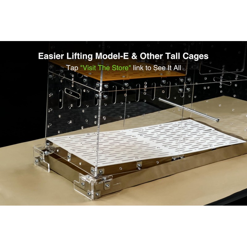 - When cleaning a large Model-A cage, it’s often necessary to lift the cage and brush off any dirty bedding that has stuck to the bottom. Handling a large cage alone can be unwieldy, as you have to lift the entire cage to brush off the dirt. If one side slips and touches the bedding again, it can pick up more debris. Ideally, you want to lift the cage with one hand while using the other hand to brush off the bedding, then remove the cage without it picking up any mess.