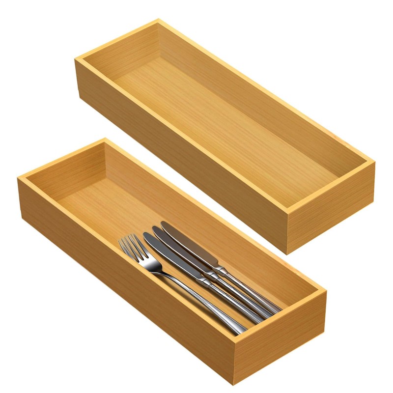 guiogc Set of 2 Bamboo Drawer Organizer, Stackable Utensil Organizer for Kitchen, Bamboo Storage Box Wood Silverware Tray for Drawer