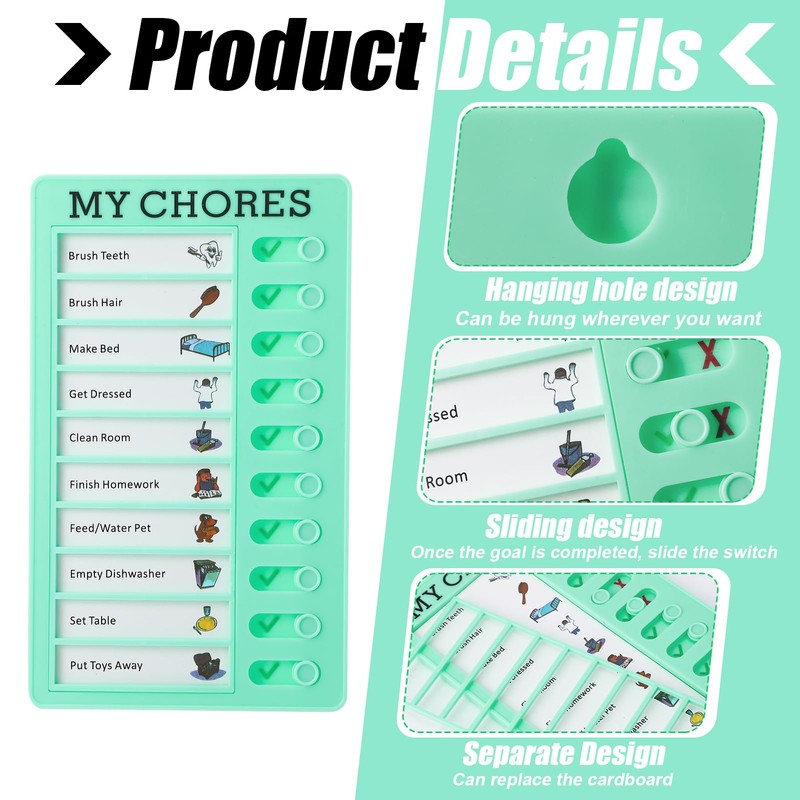 - Colorful Chore Charts :Available in pink, blue, and green, these visual schedule boards help kids and adults stay organized and develop routines. Perfect as a kids chore chart or routine chart for the whole family
