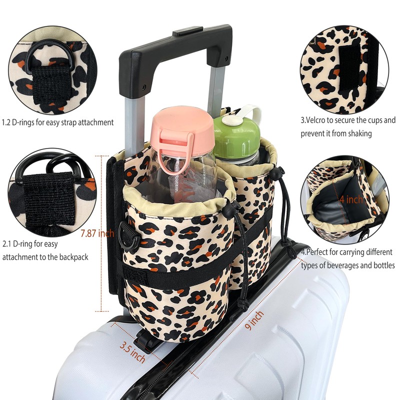 GuirCygne Travel Cup Holder for Luggage – Robust Reliable, Secure Convenient, 2-Cup Capacity, Fit Most Roll-on Suitcases, Heavy-Duty Waterproof Easy to Install, Perfect for Frequent Travelers Leopard