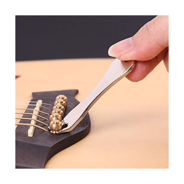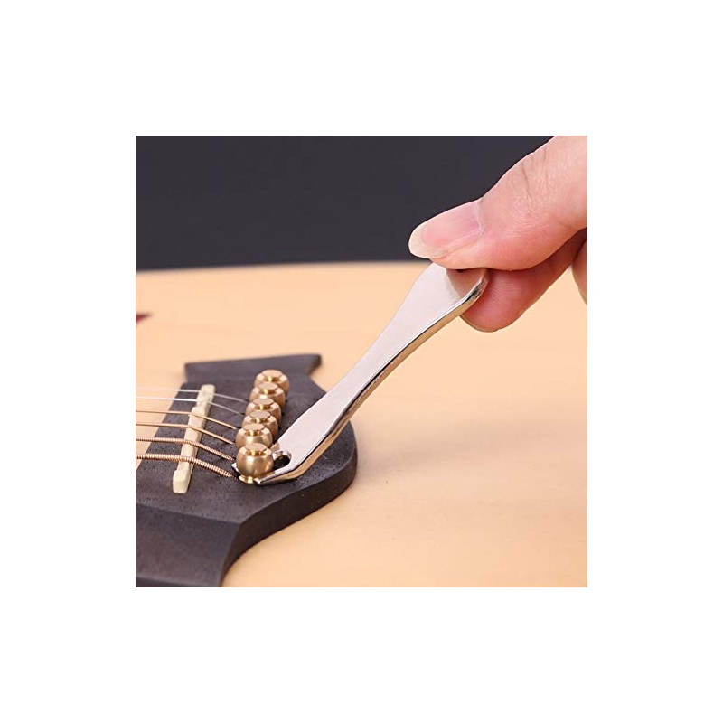 • Small, lightweight. So it won't take up too much space in the guitar case or parts drawer or even on a key ring. Just use the saddle as the fulcrum and not the soft wood of the bridge. Light pressure will loosen the pin and you can just pull it straight out without any more levering