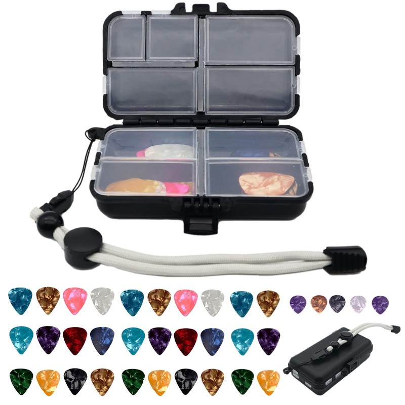 - Compact guitar pick holder opens with 9 grids and lids to separate different guitar picks. The 9 grids guitar case is suitable for various size guitar picks. You can also store small guitar accessories at the same time