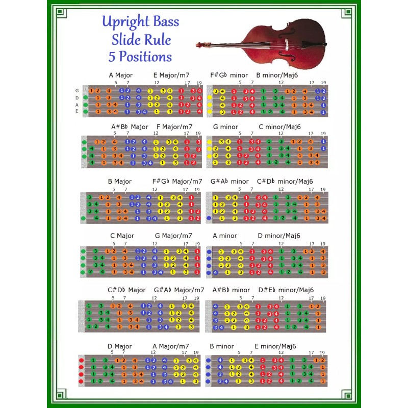 GUITARSLIDERULE UPRIGHT BASS SLIDE RULE CHART - 5 POSITIONS - FINGERING IN ANY KEY !