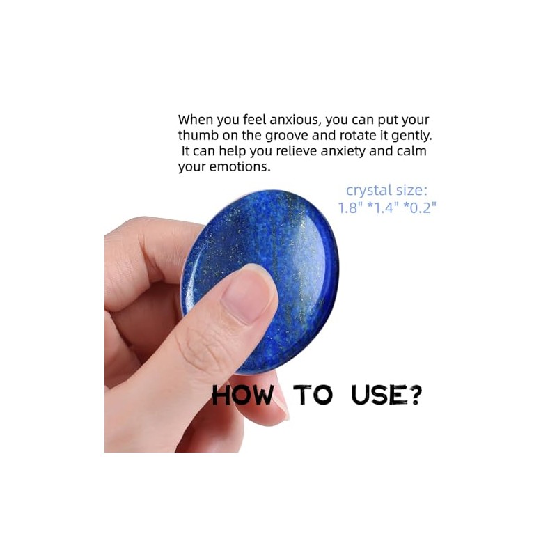 Thumb Worry Stone Crystals: There will be a smooth indentation on each stone. When you feel worried, use your thumb to gently move the concave position to help relieve anxiety and stress and calm the body and mind. Healing crystals have a cooling effect of their own, which can make you feel relaxed when placed in your hands and help with meditation.Lapis Lazuli Size: The size of the product is 1.8*1.3*0.27inch. The weight is: 15 g. It's suitable for carrying around in your pocket.Healing crystals gemstone:Crystals can help us stabilize our emotions, purify our minds, and improve our concentration. It can also reduce bad energy and bring us luck.This worry stone crystal is perfect as a gift. Healing crystals can bring the best blessings to your friends and family.