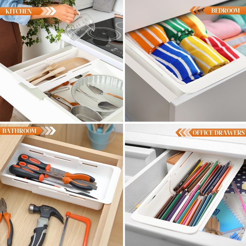 • [Adjustable Fit for Any Drawer] Designed to expand from 12.4in to 15.3in, this sliding organizer adjusts to fit horizontally or vertically in most drawers. The customizable length ensures it holds everything you need at your fingertips while maximizing space