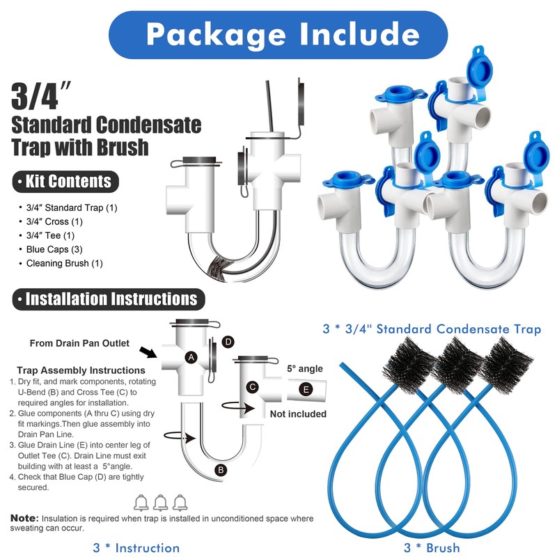- Quality Material: the condensate trap is made of quality PVC, which is durable; Besides, it is very easy to install and can work well on your 3/4 inch PVC drain line for your central air conditioning, furnace condensate, and HVAC systems; Note: please remember to prime and PVC cement the clear parts so it doesn't leak