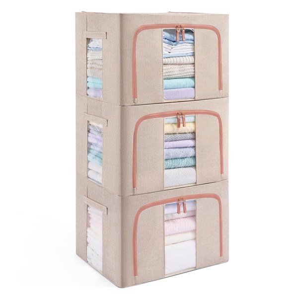 GuliPostan 3 Pack 100L Stackable Clothes Storage Bins with Metal Frame Handles & Zipper, Collapsible Closet Organizer Box with Lid for Bedding Blankets Towel (Beige)