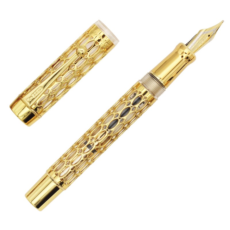 Gullor Openwork Gold Fountain Pen with Gift Box, Screw Cap, Transparent Barrel, Extra Fine Nib