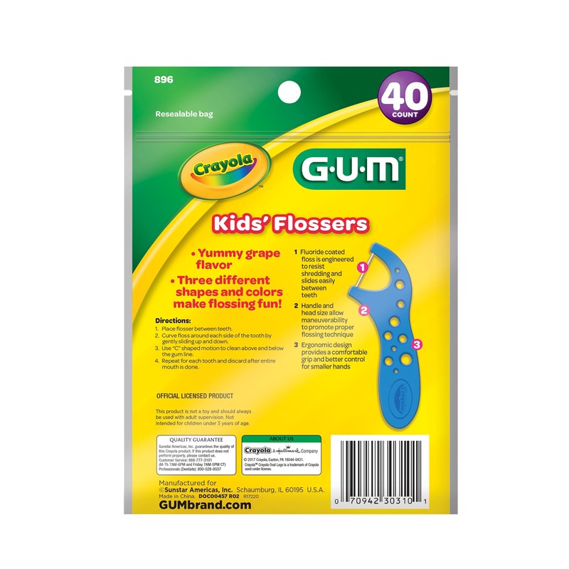 Start building healthy habits today with GUM Crayola Kids' Flossers. GUM Crayola flossers for kids turns between teeth cleaning into a fun experience for your children. Each kids flosser is crafted with an ergonomically designed handle that fits into little hands. Pre-loaded, shred resistant dental floss makes it easy for kids to clean between teeth to remove plaque and promote healthy teeth & gums. Each pack contains flossing picks in a variety of shapes and colors and comes with GUM dental floss in a delicious grape flavor. A fluoride coating helps build enamel to fight cavities. Features : Easy grip handle that fits into small hands Shred resistant, fluoride coated dental floss Yummy grape flavor Flossing is an important part of oral hygiene and dentists recommend that between teeth cleaning starts early. GUM Crayola Kids' Flossers can be used by parents & caregivers to clean between the teeth of infants and toddlers, and young children can start to use the dental flossers themselves once they begin to build dexterity.