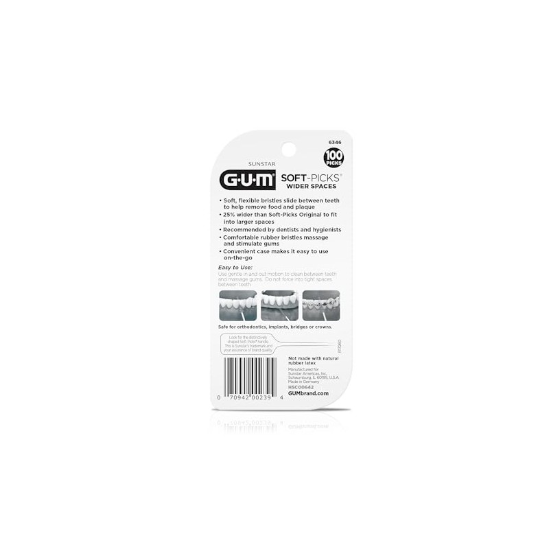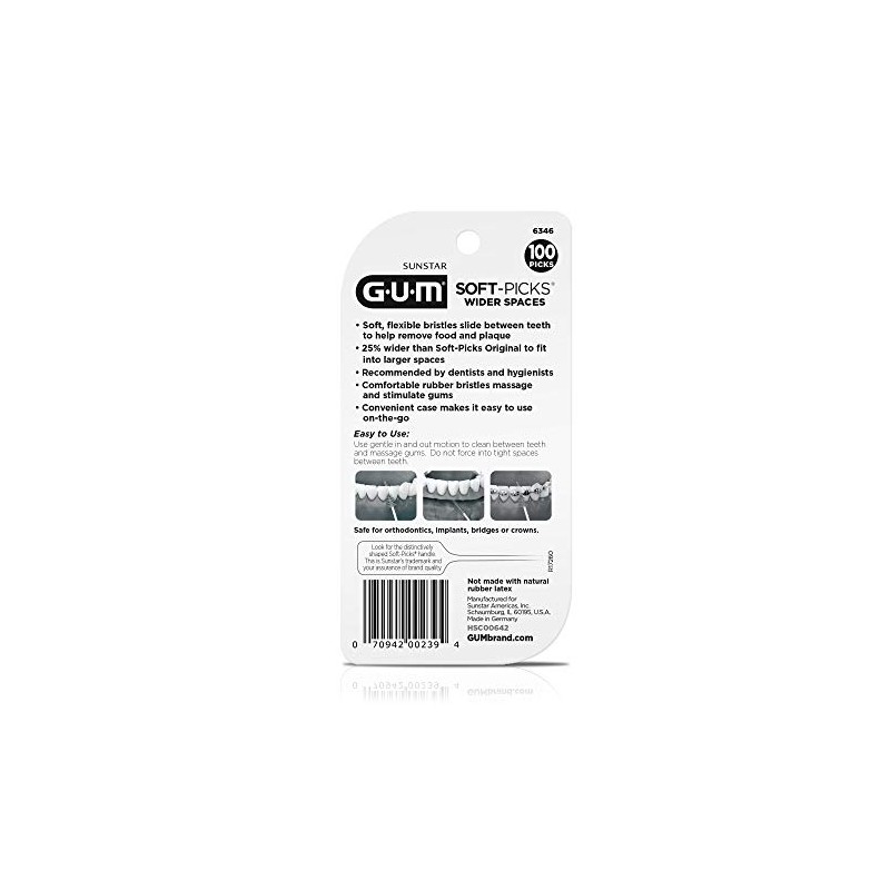 Going beyond brushing has never been easier. GUM Soft-Picks for Wider Spaces C The perfect portable interdental brushes for oral care on-the-go. Each of our dental picks features ultra-soft, rubber bristles that gently & effectively remove plaque and food particles for cleaner teeth, healthier gums, and fresher breath. Our soft picks for wider spaces feature flexible rubber bristles that are 25% wider than our Original Soft-Picks. Theyre the perfect solution to ensure a snug fit and deeper clean for those with wider interdental spaces. Super soft rubber bristles slide comfortably between teeth 25% wider than GUM Original Soft-Picks for a snug fit in wide interdental spaces Tapered design Safe for sensitive gums Latex, wood, and wire free Convenient plastic carry case Dentists and Hygienists alike recommend Soft Picks as an effective way to clean hard to reach areas in your mouth. Our Soft-Picks for Wider Spaces are especially well suited for food removal, cleaning of the front teeth, and teeth cleaning for those with wide interdental spaces, braces, bridges, or orthodontic appliances. Carry good oral care hygiene with you wherever you go. Each GUM Soft-Picks comes with a convenient plastic carrying case that fits easily into handbags, pockets, and glove boxes. Now that's something to smile about!