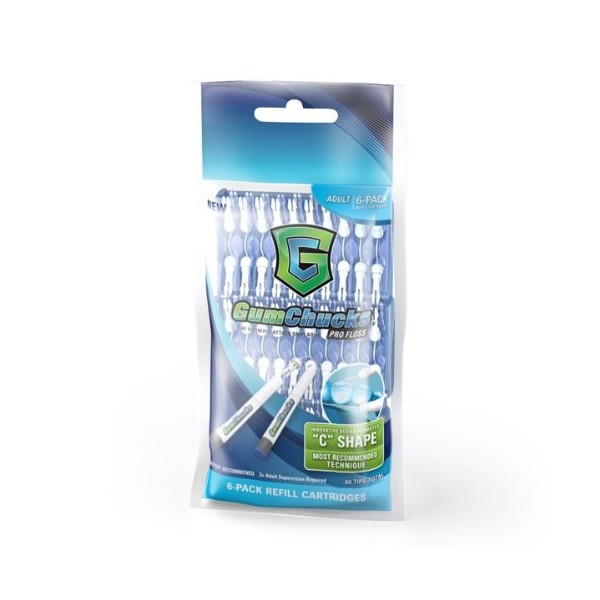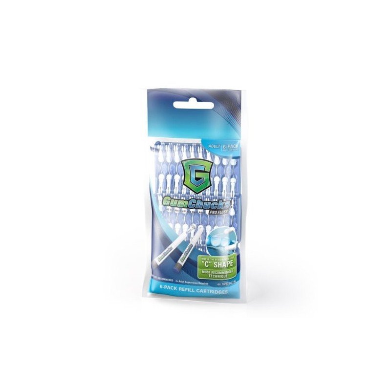 Adult PRO FLOSS 6-pack Flossing Tip Replacement Cartridges. Each Refill Cartridge holds 10 disposable flossing tips, 6 Cartridges per package. Disposable flossing tips include a 22-mm piece of lightly waxed, high quality dental floss. Made with 250 strands of twisted fiber, the floss has a high shred tolerance to keep it gliding smoothly between teeth. And the Gumchucks quick-release button system makes it easy to chuck flossing tips after each use. Designed to fit in the Starter Kit Travel Case. These are the standard flossing tips and will work in all the Gumchucks handles.